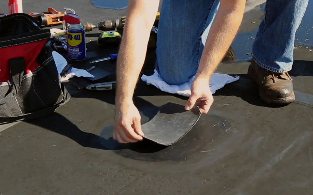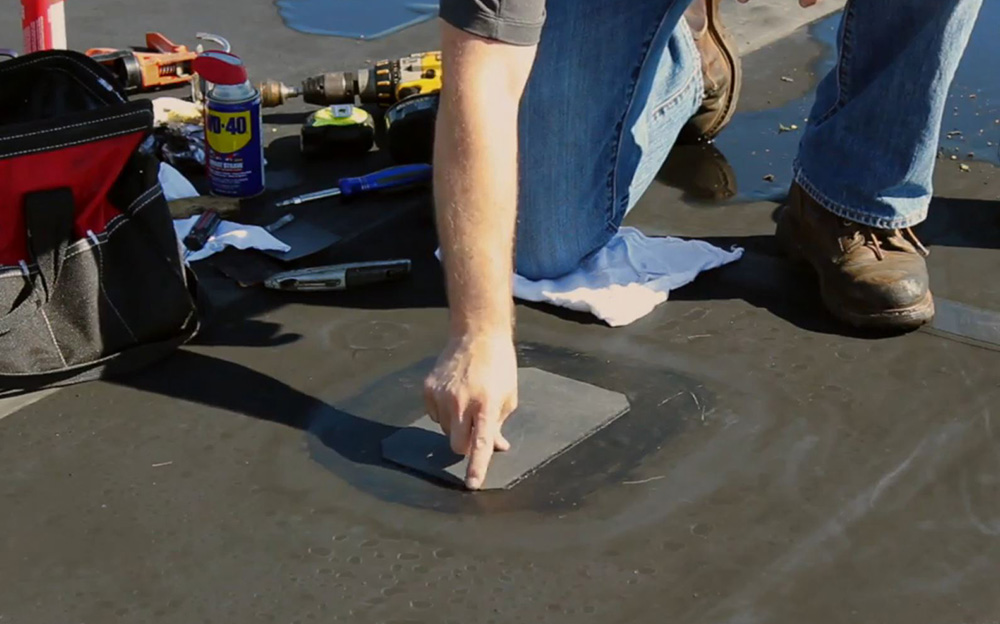 Apply the adhesive to the underside of the membrane patch and the surface of the area to be patched. Allow the adhesive to flash off until it is no longer tacky to the touch. After the glue has flashed off you will carefully mate the patch material to the surface of the roof.