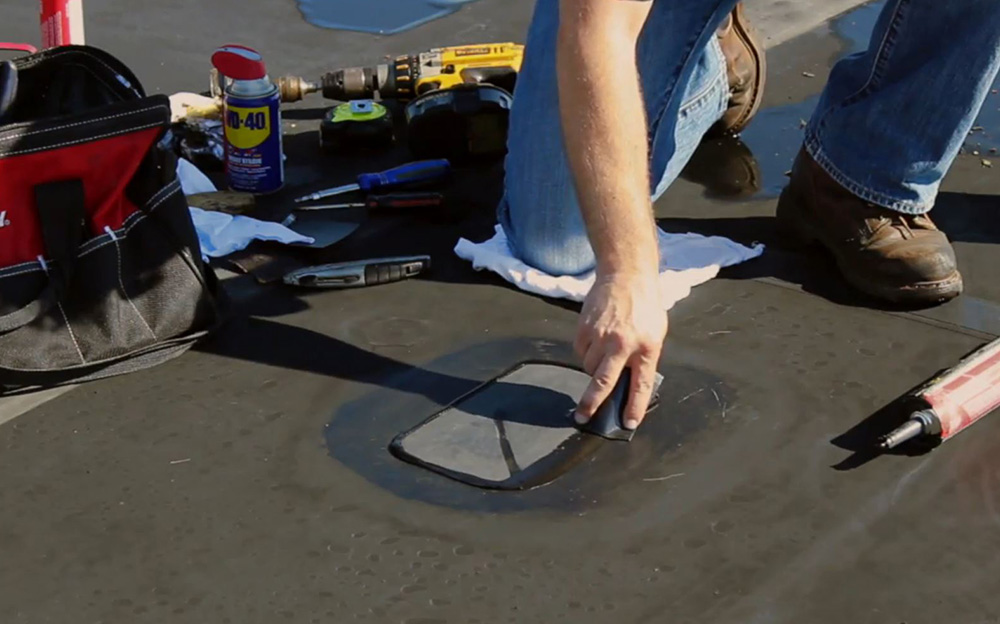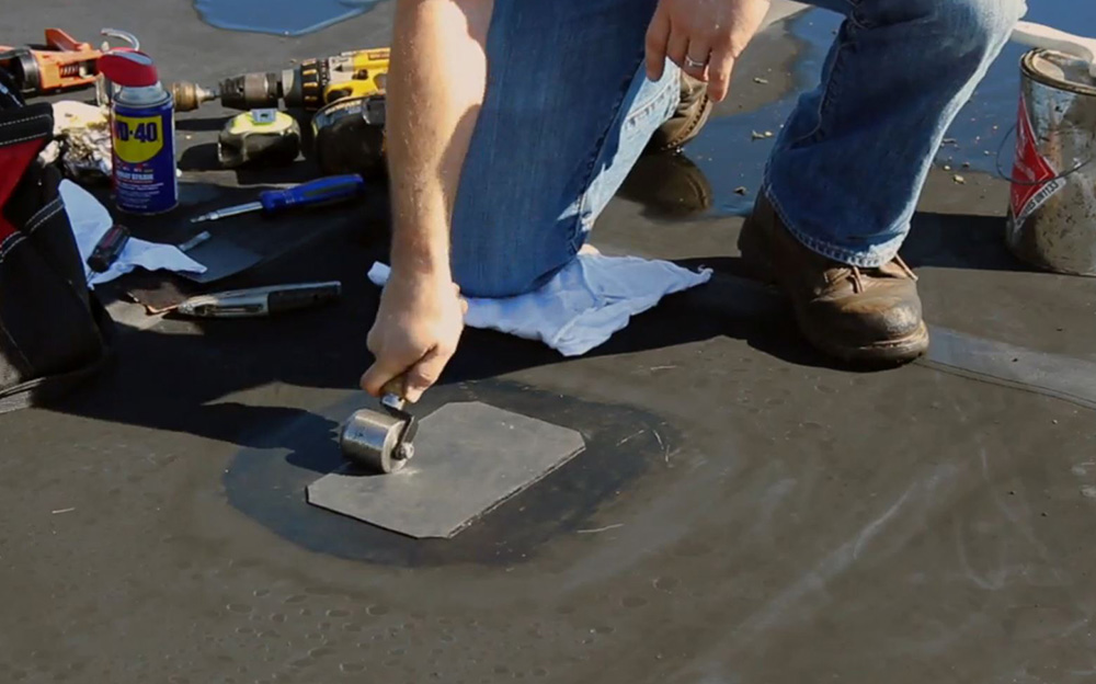 It is best to use a steel roller to apply the patch to the surface of the roof. The steel roller applies even pressure over the roof patch as it is passed back and forth across the patch and it allows you to press any trapped air out from under the repair patch.