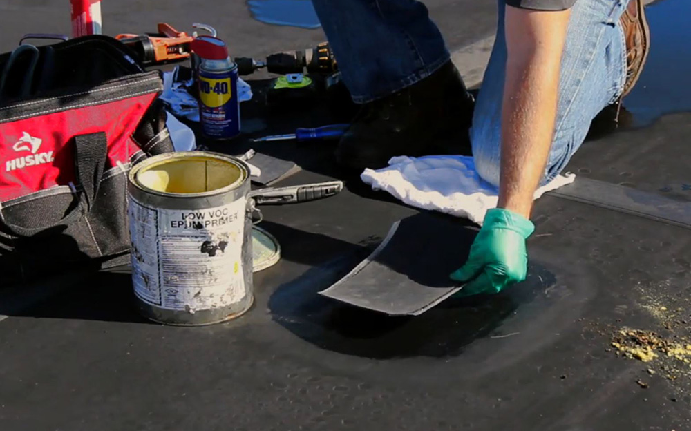 The next step in applying the patch after properly cleaning the roof surface is to apply a thin coat of primer to the membrane surface. When applying the primer use a paint roller with a medium nap roller or paint brush to apply a thin coat of primer to the area where the patch is to be applied.